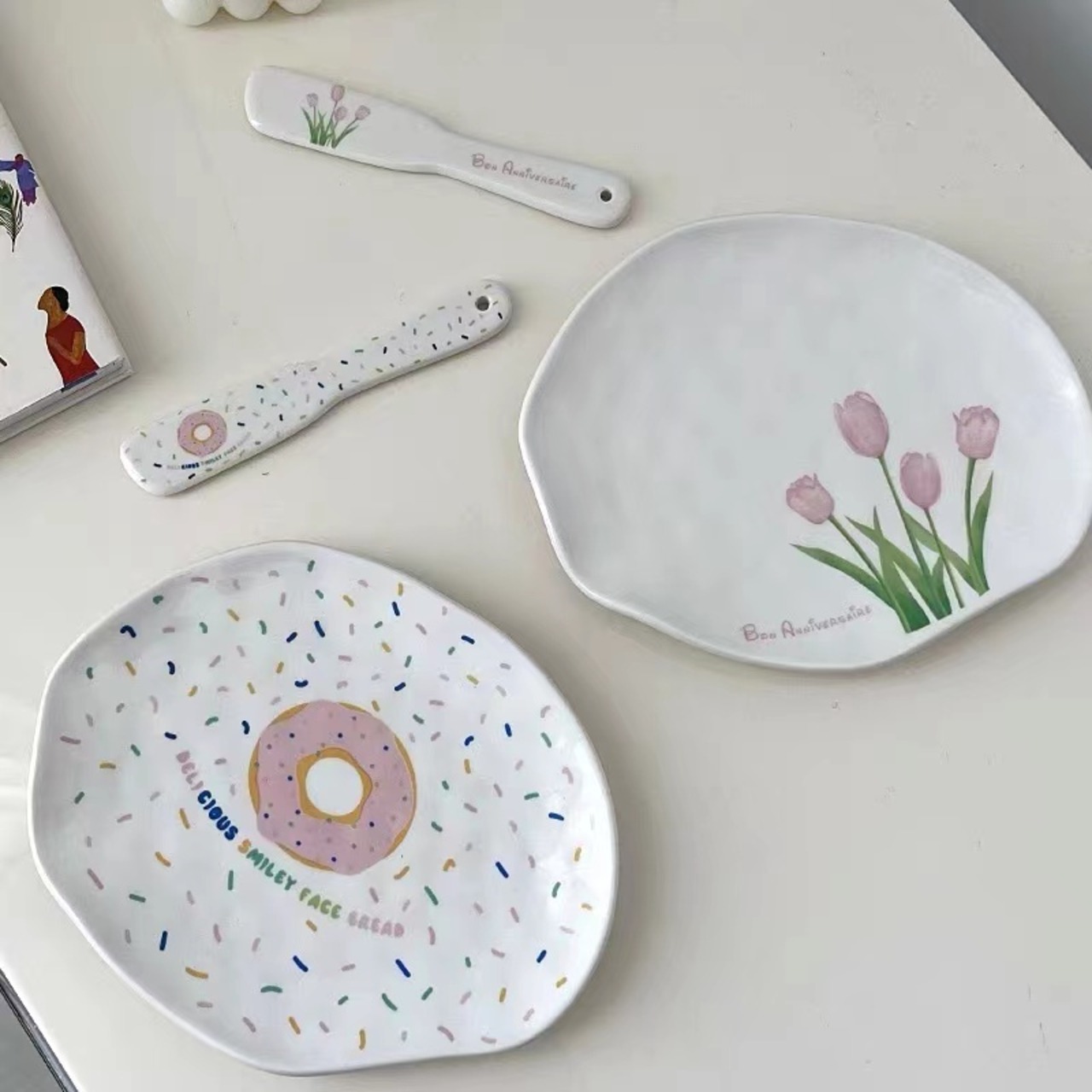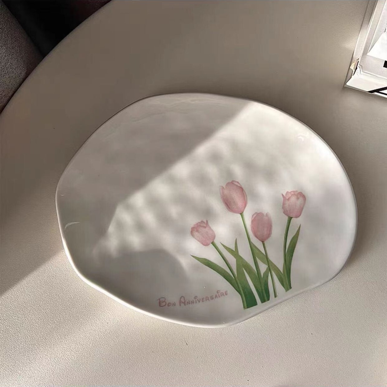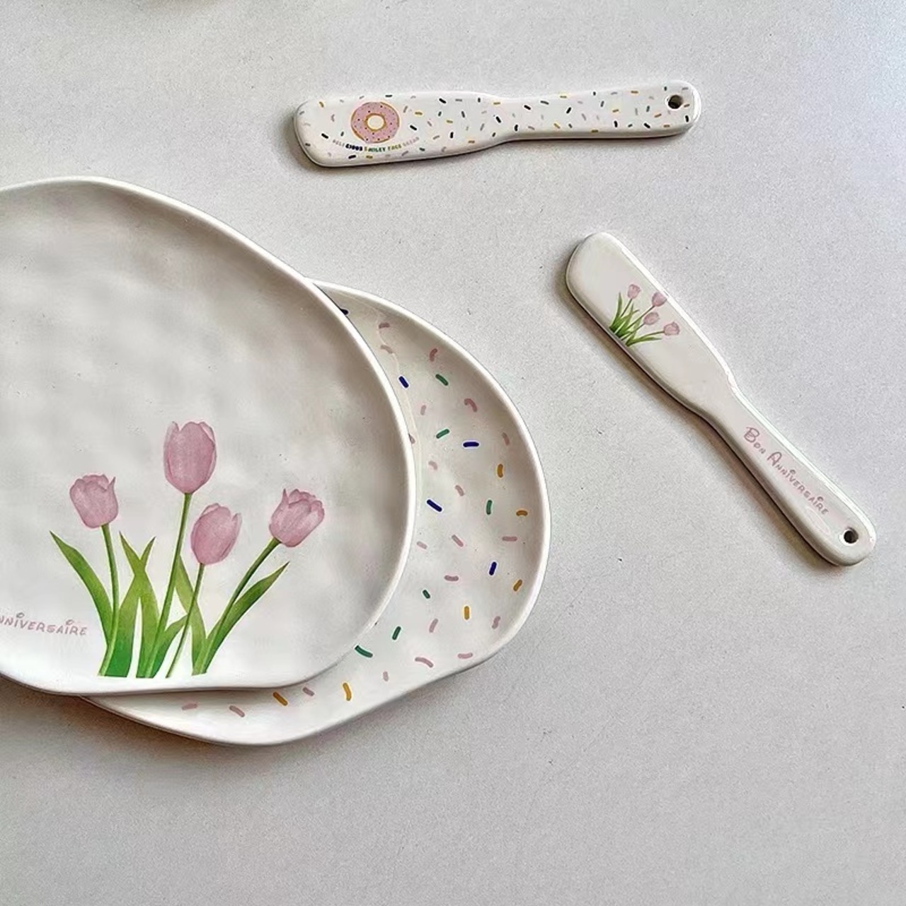 ★送料無料★韓国風 不規則プレート チューリップ柄プレート デザートプレート お皿 バターナイフ ホワイトトレー アクセサリー展示台 アクセサリートレー 変形 不規則 小物収納 アクセサリー収納 コースター 韓国雑貨 小物収納 韓国ファッション