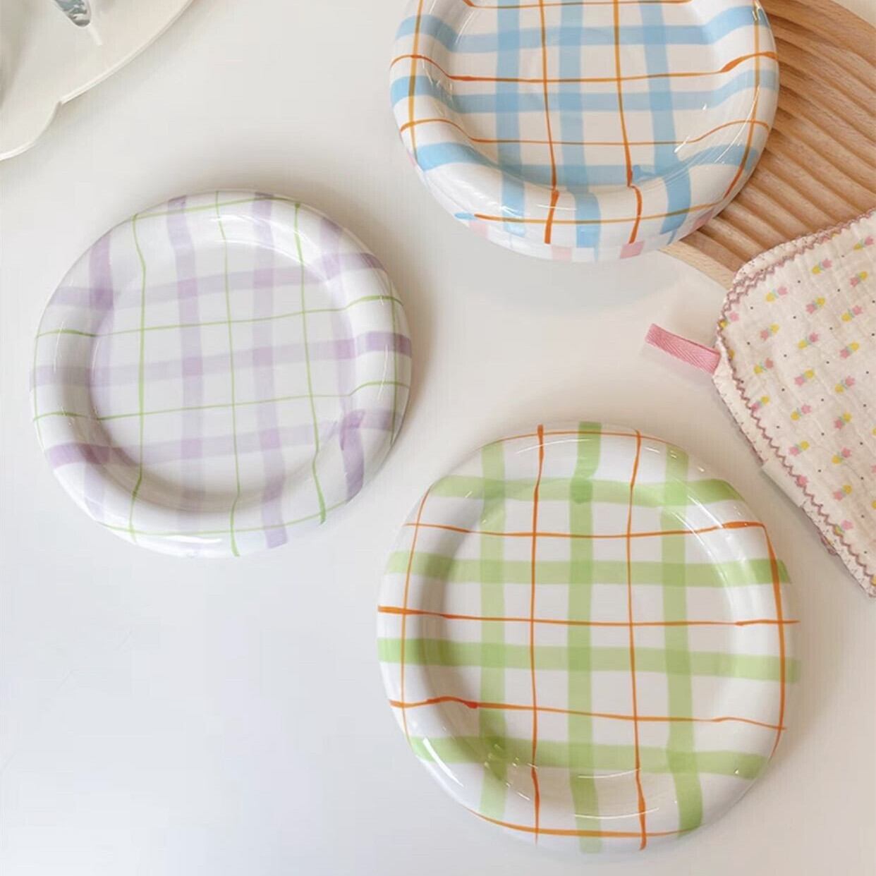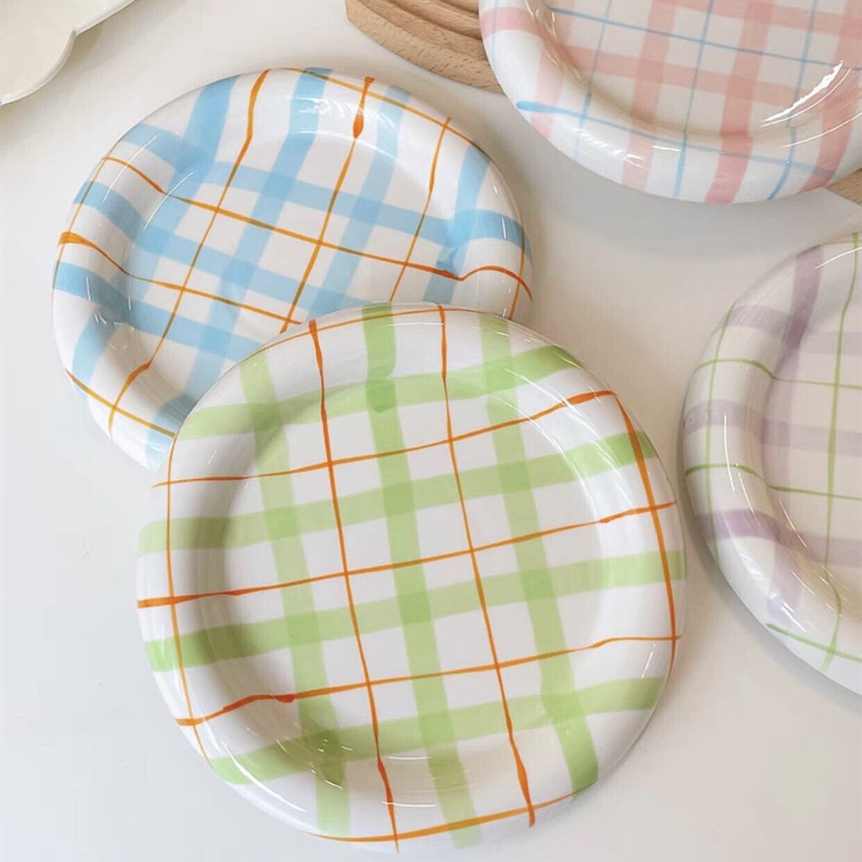 ★送料無料★韓国風 不規則プレート 円形プレート デザートプレート お皿 チェック柄 ホワイトトレー アクセサリー展示台 アクセサリートレー 変形 不規則 小物収納 アクセサリー収納 コースター 韓国雑貨 小物収納 韓国ファッション